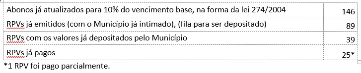 Visando agilizar os processos de pagamento e evitar bloqueios judiciais nas contas do Município, foi firmado um acordo para pagamento de até 20 mil reais mensais. Sendo a ordem da fila de depósitos estabelecida a partir da expedição dos RPVs pela Juíza.