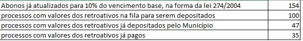 Foi pago a diferença do abono salarial retroativa a mais 3 servidoras. OS contemplados desta vez foram Marta Righetti T. Vargas e Maria Emília Lacerda da Silva, ambas já aposentadas, mas que entraram com as ações quando estavam na ativa. A outra Servidora preferiu não se identificar
