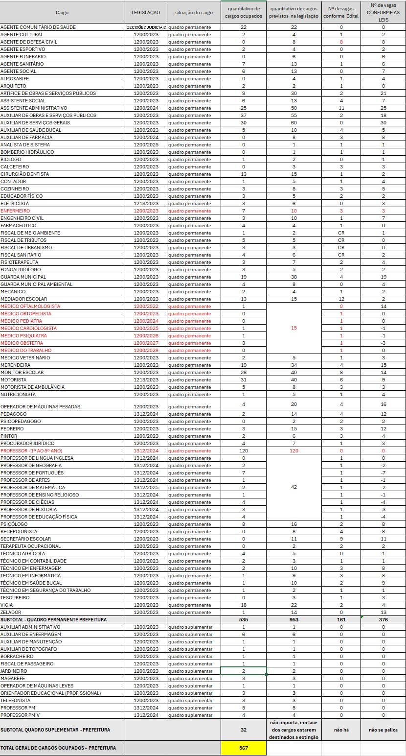Há duas colunas com o quantitativo de vagas por cargos, isto porque a lei determina um quantitativo de cargos, mas no edital o Prefeito pode determinar outro, para aquele momento em que é realizado o concurso. Assim, atualmente temos um número de vagas determinado pelas leis Municipais e outro quantitativo, informado pelo edital de convocação do concurso realizado em 2024. Importante lembrar que conforme o número de vagas previstos no edital do concurso, o Prefeito é obrigado a convocar os candidatos aprovados dentro do limite de vagas estabelecido.